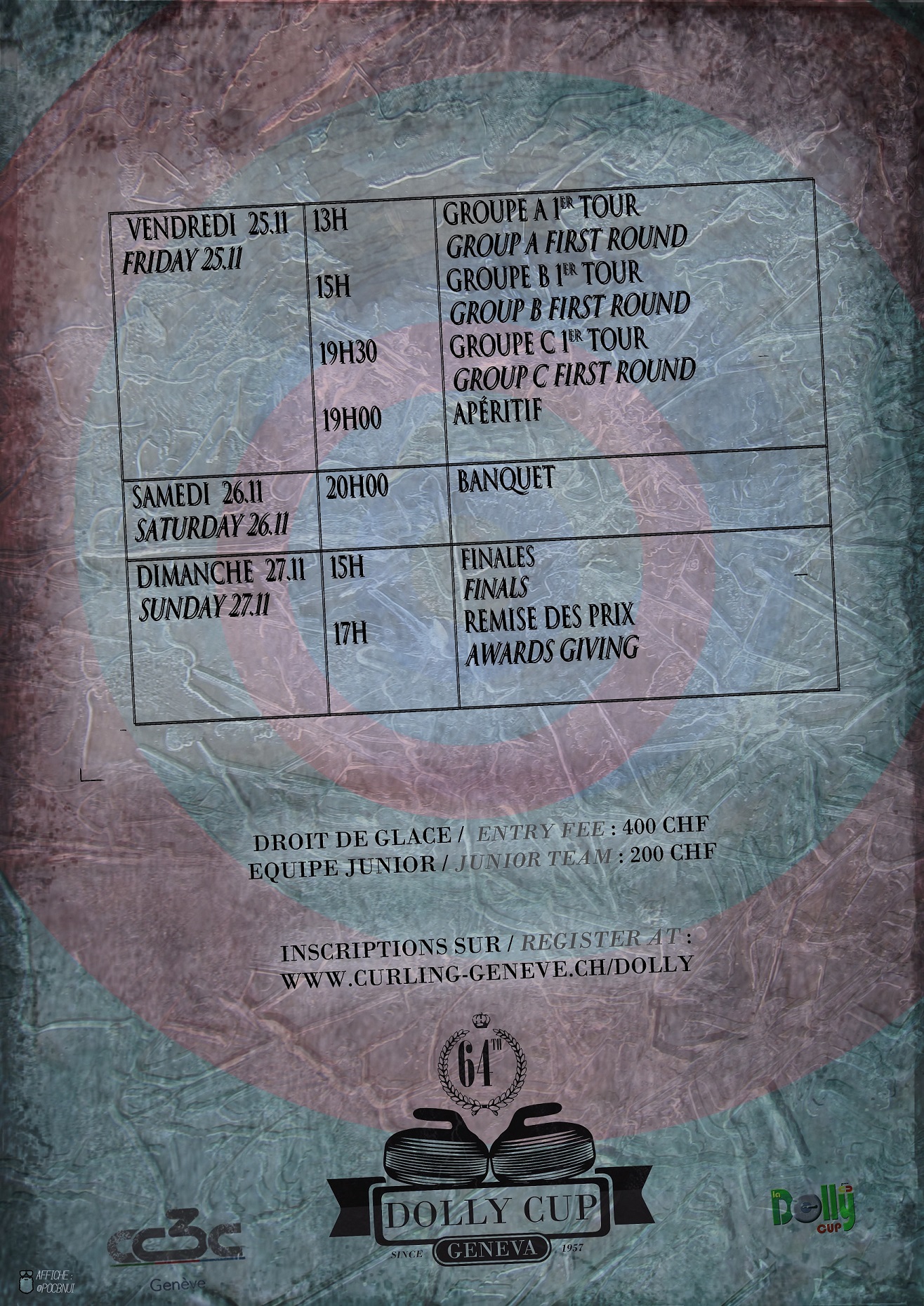 Je vous rappelle que notre habituelle Dolly Cup aura lieu du 25 au 27 novembre 2022 pour sa 64ème édition. Il y a encore de la place et nous serions très honorés de vous recevoir !A noter que chaque équipe participant à la fois au Tournoi des 30 ans des JO d’Albertville les 3-4 décembre et à la Dolly a un rabais sur le droit de glace !Toutes les informations et le programme sont disponibles dans le flyer ci-joint et l’inscription est possible par le lien suivant:Au plaisir de vous (re)voir à Genève prochainement !D’ici là, nous vous souhaitons de bonnes pierres.Salutations sportivesLiebe Curlerinnen und Curler,Ich möchte Sie daran erinnern, dass unser üblicher Dolly Cup vom 25. bis zum 27. November 2022 zum 64. Ausgabe stattfindet. Es ist noch Platz und wir würden uns sehr freuen, Sie bei uns erhalten!Beachten Sie, dass jedes Team, das sowohl am 30. Jubiläumsturnier der Olympischen Spiele in Albertville vom 3. bis 4. Dezember als auch am Dolly teilnimmt, einen Rabatt auf die Anmeldung hat!